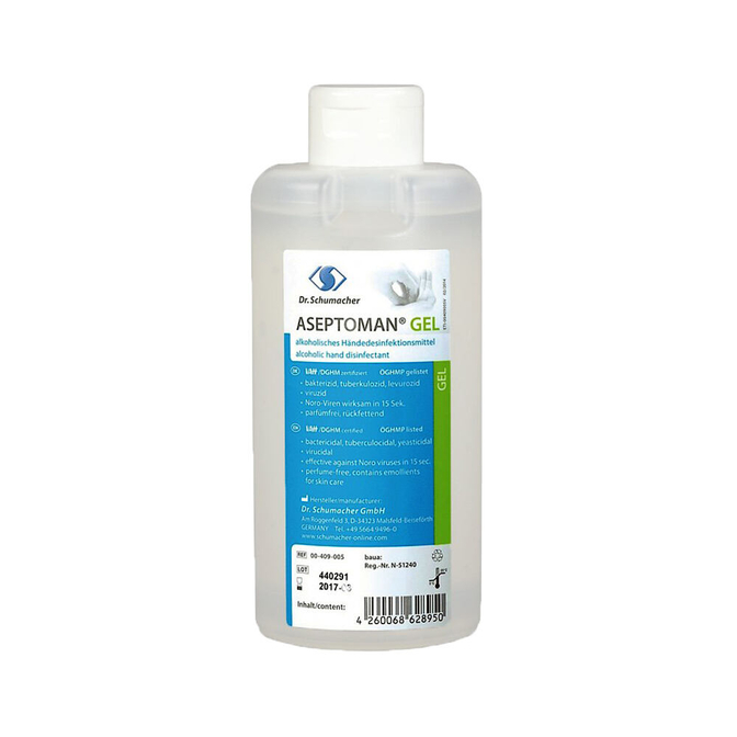 Αλκοολούχο αντισηπτικό χεριών σε μορφή gel για επάλειψη στα χέρια. Το ASEPTOMAN GEL είναι κατάλληλο για την καθημερινή υγιεινή απολύμανση χεριών με ένα ευρύ φάσμα αποτελεσματικότητας. Είναι άοσμο και είναι συμβατό με όλα τα κρεμοσάπουνα. Δεν περιέχει αλδεϋδες, φαινόλες και τεταρτογενή αμμωνιακά άλατα.
