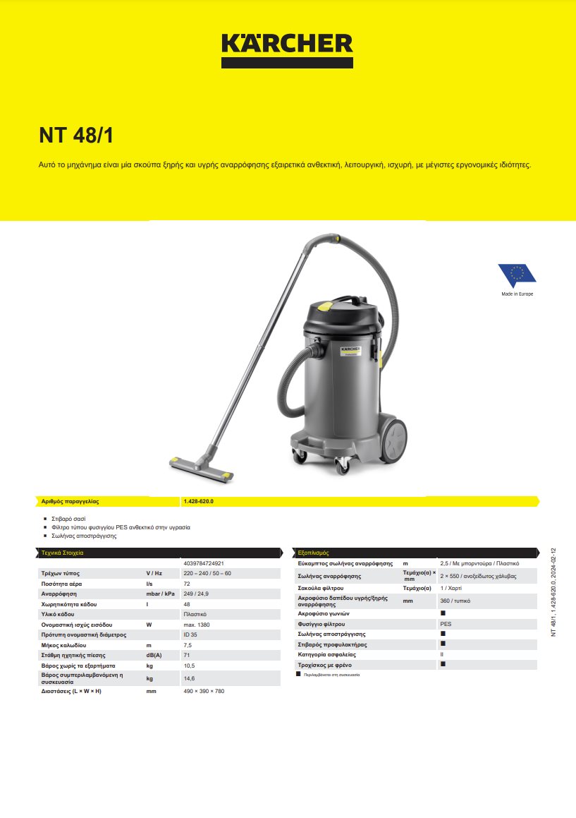 Η Kärcher NT 48/1 είναι μία επαγγελματική ηλεκτρική σκούπα με χωρητικότητα κάδου 48L. Είναι εξοπλισμένη με ενσωματωμένο γάντζο καλωδίου και θήκη εξαρτημάτων για σωλήνες αναρρόφησης, εξάρτημα δαπέδου και εξάρτημα γωνιών. Η μεγάλη θήκη του φίλτρου με τη μεγάλη επιφάνεια της (0,8τ.μ.) παρέχει συνεχόμενα υψηλή ισχύ αναρρόφησης. Το σύστημα float εξασφαλίζει ασφαλή διακοπή της ροής του αέρα από όλα τα αναρροφούμενα υγρά. Οποιαδήποτε στιγμή τα εργαλεία μπορούν να αποθηκευτούν και να είναι έτοιμα για χρήση στην μεγάλη περιοχή αποθήκευσης στην κεφαλή της σκούπας. Η άνετη μεταφορά εξασφαλίζεται από τον εύκολα προσβάσιμο σωλήνα αποστράγγισης, το ανθεκτικό πλαίσιο με μεγάλους τροχούς, τα ροδάκια, κατασκευασμένα από μέταλλο με φρένο και τη λαβή μεταφοράς.