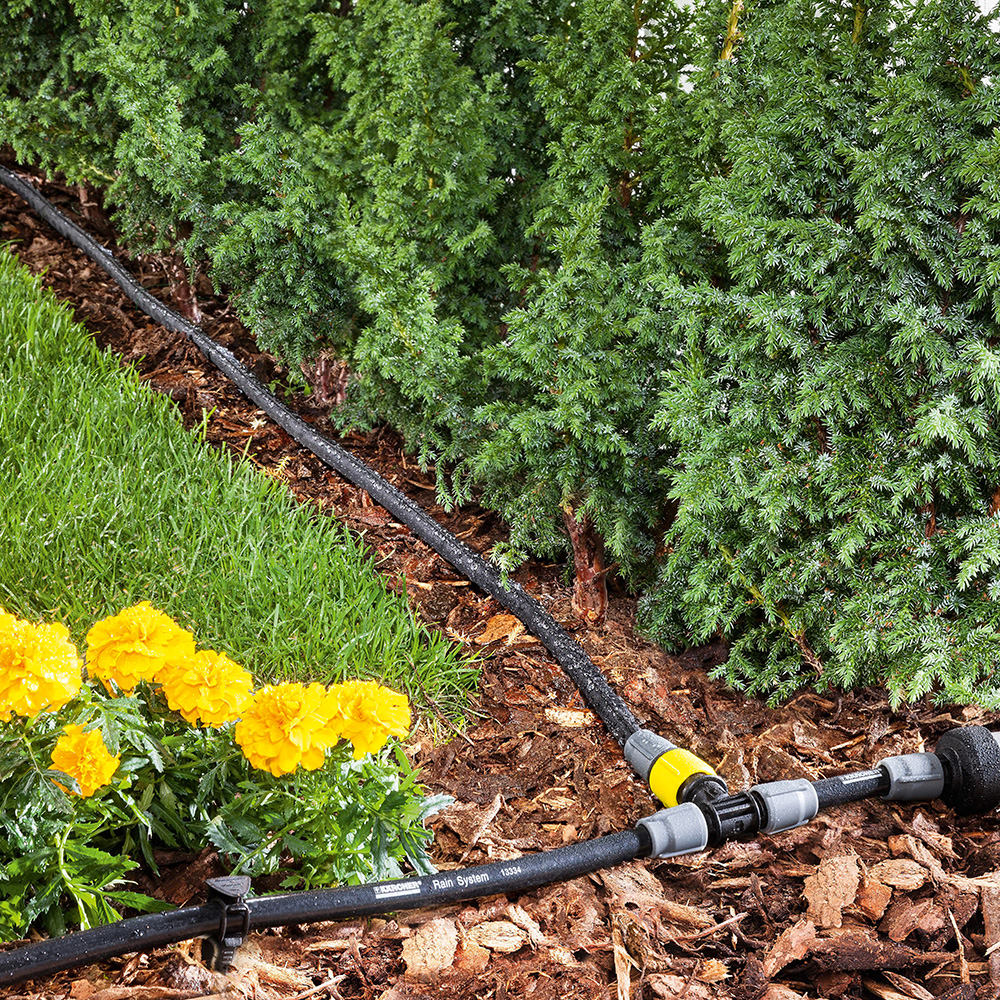 Το λάστιχο απλά συνδέεται με το σύνδεσμο Τ και σταθεροποιείται με το ρακόρ (περικόχλιο ένωσης). Το ιδιαίτερα αποδοτικό Kärcher Rain System™ συνδυάζει τα πλεονεκτήματα του micro-dripping και του συμβατικού ποτίσματος, λειτουργεί με μέγιστη πίεση τα 4 bar και περιλαμβάνει λάστιχο 1/2" με δακτύλιους σταγόνας και ψεκασμού. Το Kärcher Rain System™ μπορεί να προσαρμοστεί σε σχεδόν οποιοδήποτε κήπο ενώ συνεργάζεται τέλεια με τον προγραμματιστή Senso Timer για πότισμα σύμφωνα με τις ανάγκες του κήπου σας.