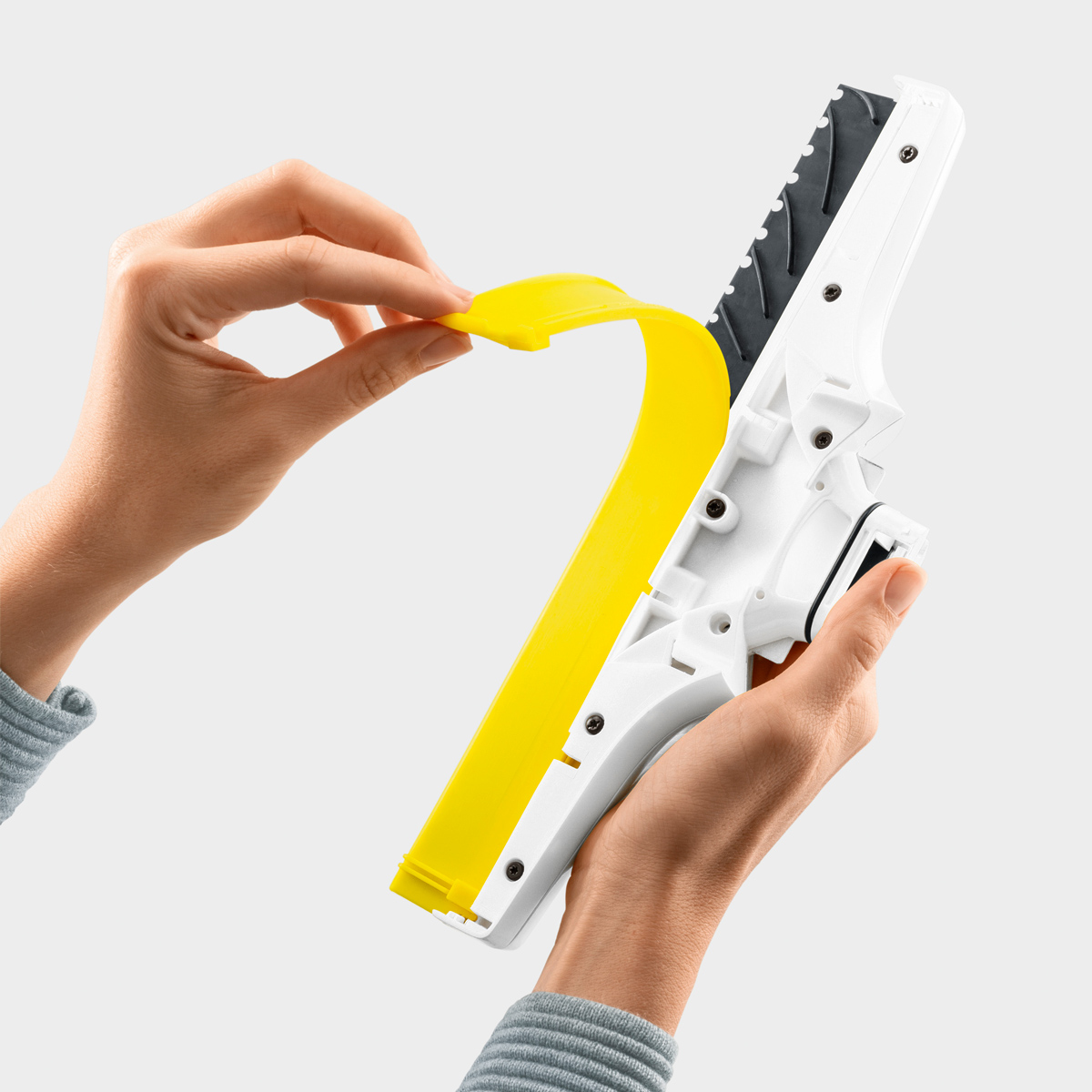 Kärcher has improved its original cordless Window Vac again and developed an even more flexible model featuring innovative blade technology and longer battery runtime – the WV 6 Plus D500. The new wider suction blade allows you to remove excess fluid from entire surfaces without stopping. The cordless Window Vac's extra-long runtime of 100 minutes means you can keep going for even longer. You can also plan your cleaning precisely thanks to the display, which indicates the remaining battery runtime down to the nearest minute. As usual, the intelligent combination of spray bottle and microfibre wiping cloth, along with the suction function on the Window Vac, ensures extremely effective cleaning and sparkling clean windows – with no streaks or residues. The ergonomic WV 6 Plus D500 cordless Window Vac by Kärcher also allows you to clean your windows in an especially hygienic way, because you do not come into direct contact with the dirty water.